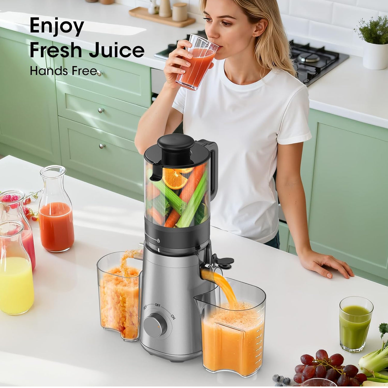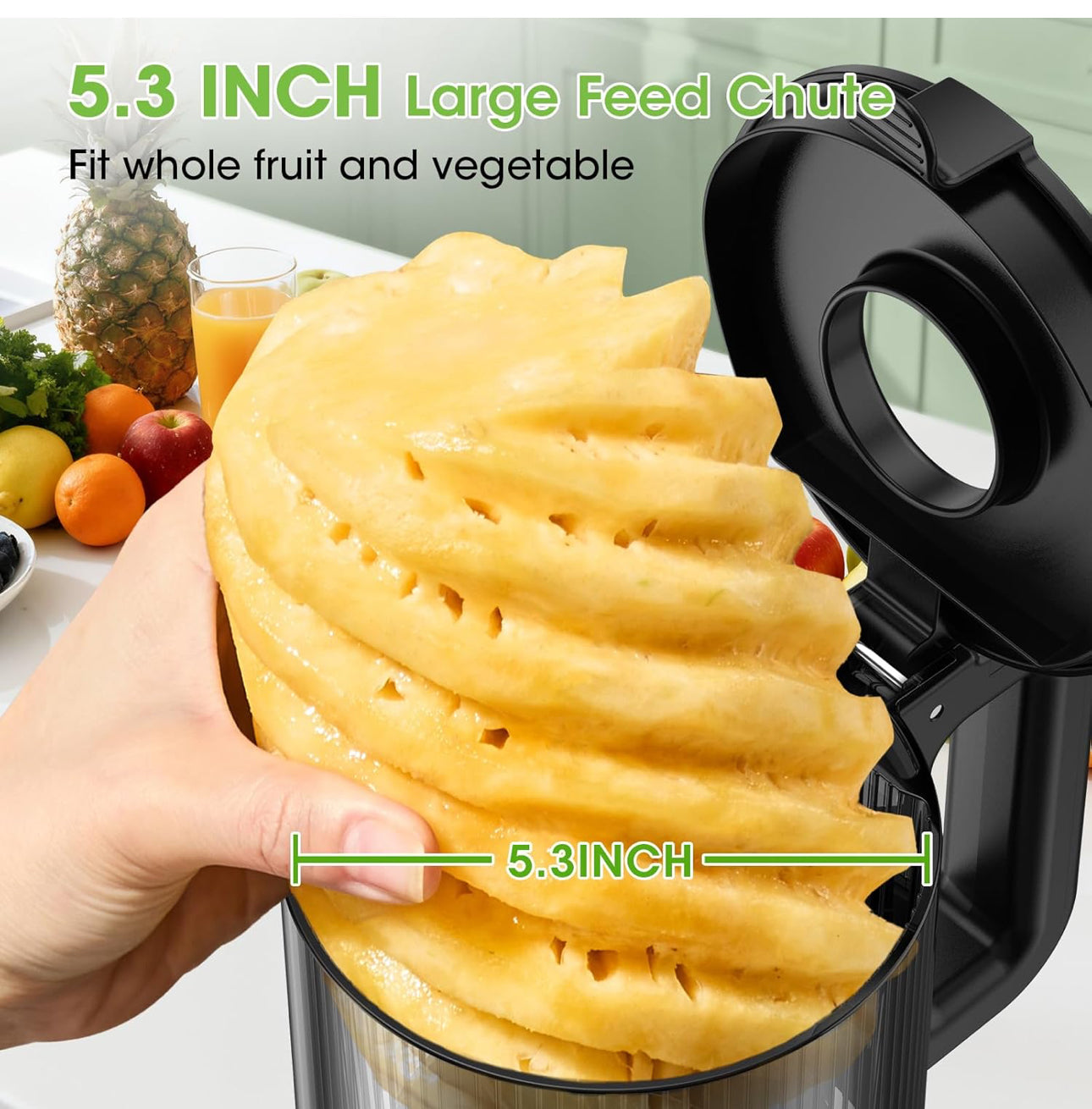 - ๐ Higher Juice Yield & Hands-Free Operation: Featuring a 5.3-inch wide feed chute and a 60-oz large-capacity hopper, this juicer allows you to add whole fruits and vegetables at once for processing. Free up your hands to handle other kitchen tasks while it works efficiently on its own.