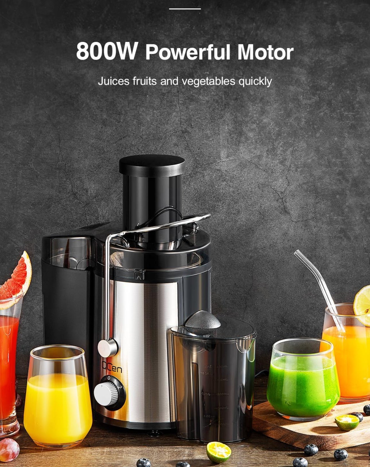 Qcen Juicer Machine, 800W Centrifugal Juicer Extractor with Wide Mouth 3” Feed Chute for Fruit Vegetable, Easy to Clean, Stainless Steel, BPA-free (Black)