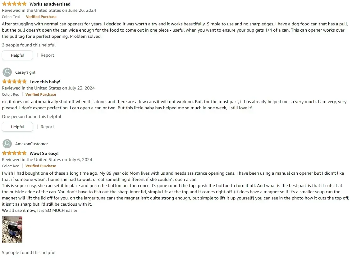 【Easy operation】Open almost any cans with our electric can opener. Press the button to start. It cuts cleanly around the side of cans leaving smooth edges. Press the button again to stop. EASY!